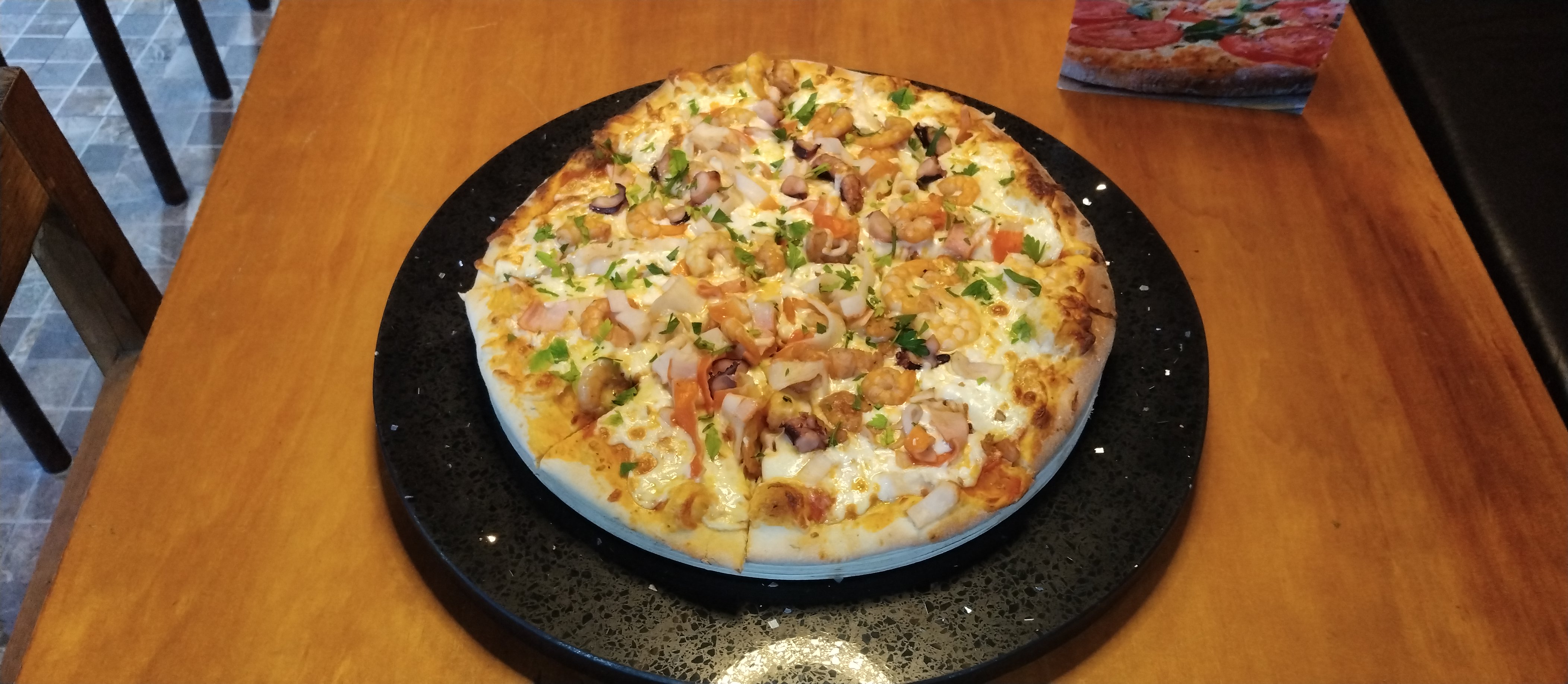 Alejandro explica que la intención siempre fue “romper con lo tradicional y dar a la gente la oportunidad de probar una pizza más natural”. Y lo logró. La carta, cuidadosamente pulida durante tres años, ofrece opciones para todos los gustos: desde las clásicas hawaiana, peperoni y carnes frías, hasta las vegetarianas —como tres quesos— y una serie de especialidades que han tenido gran aceptación. Entre ellas destacan la pizza española, preparada con jamón serrano, aceituna y alcachofa; la yucateca, con sabores inspirados en la cocina tradicional; la pizza de mariscos, que sorprende por su frescura; y por supuesto la estrella dulce: nutella con fresa y plátano, también horneada en el horno de barro.